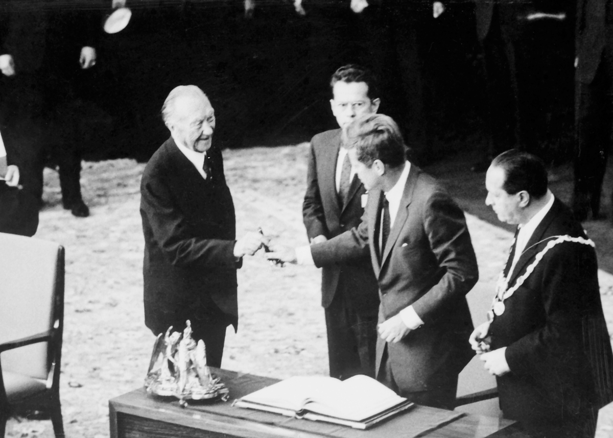 다음은 엘리제 조약입니다. 엘리제 조약은 제1, 2차 세계대전 이후로 앙숙 관계를 유지하던 독일과 프랑스가 맺은 역사적인 이벤트입니다. 프랑스 대통령 샤를 드 골과 서독의 초대 총리 콘라트 아데나워가 소련과 미국을 견제하고, 양국의 세력을 다지기 위해 1963년 엘리제 궁에서 맺은 조약이라고 합니다. 당시 중재자로서 미국의 존 F. 케네디 대통령이 함께 했었는데요, 그때 아데나워 총리가 케네디 대통령에게 몽블랑 만년필을 건네는 사진이 아직까지 남아있습니다.